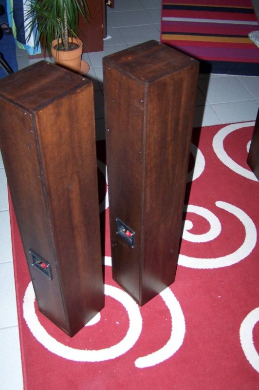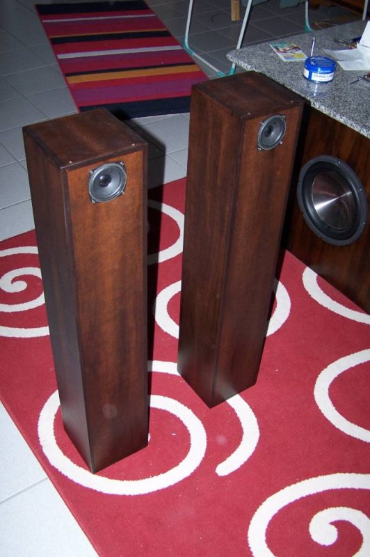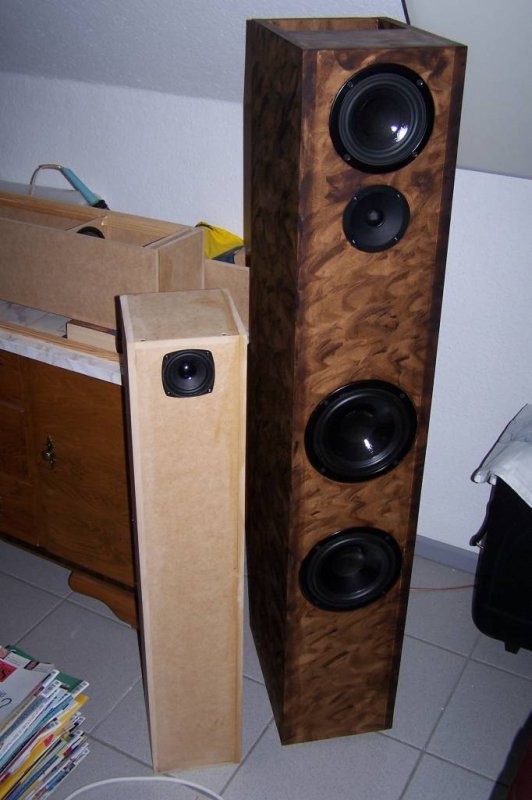 Mein bekannter ist ebenfalls von den Boxen überzeugt, ihm gefallen sie seeeeeehr gut. Klein, kein großes sichtbares Chassis und richtig schöner Klang, Mission erfolgreich, die stehen also ab sofort bei ihm im Wohnzimmer :-) Meine Freundin will ich an dieser stelle noch lobend erwähnen - sie hat fleissig mit geholfen, hat Kabel gelötet und beim Leimen geholfen, nur geschliffen hab ich allein, von Hand ;-)